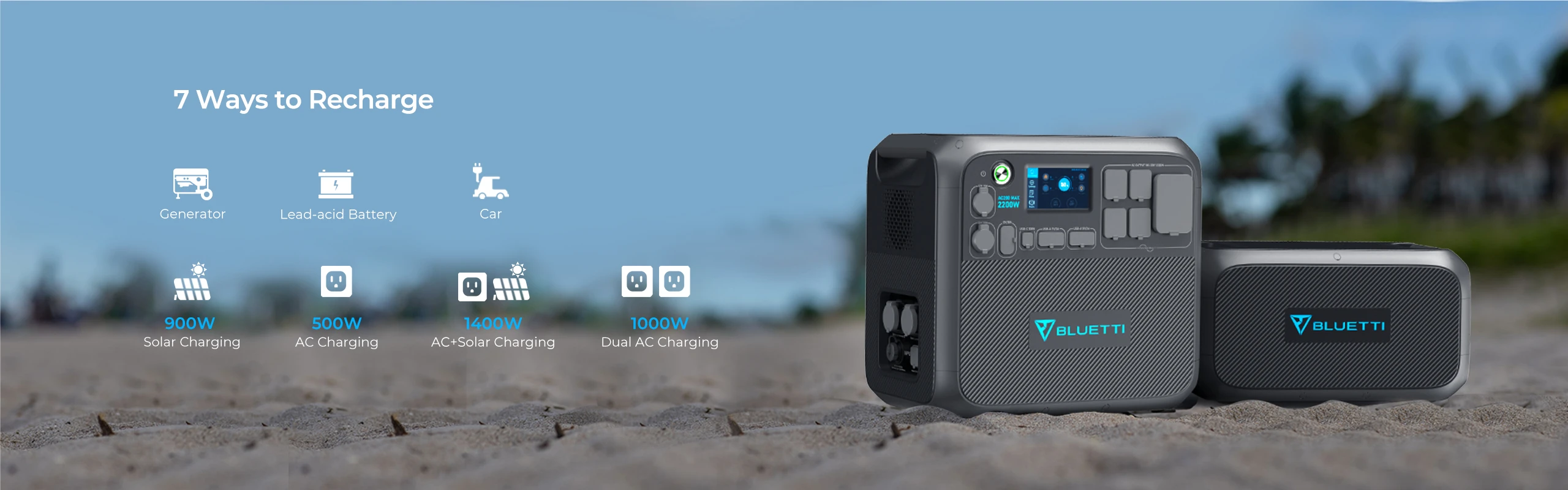 - 7 Ways to Recharge (AC/Solar/Car/Generator/Lead Battery/Dual AC/AC+Solar)