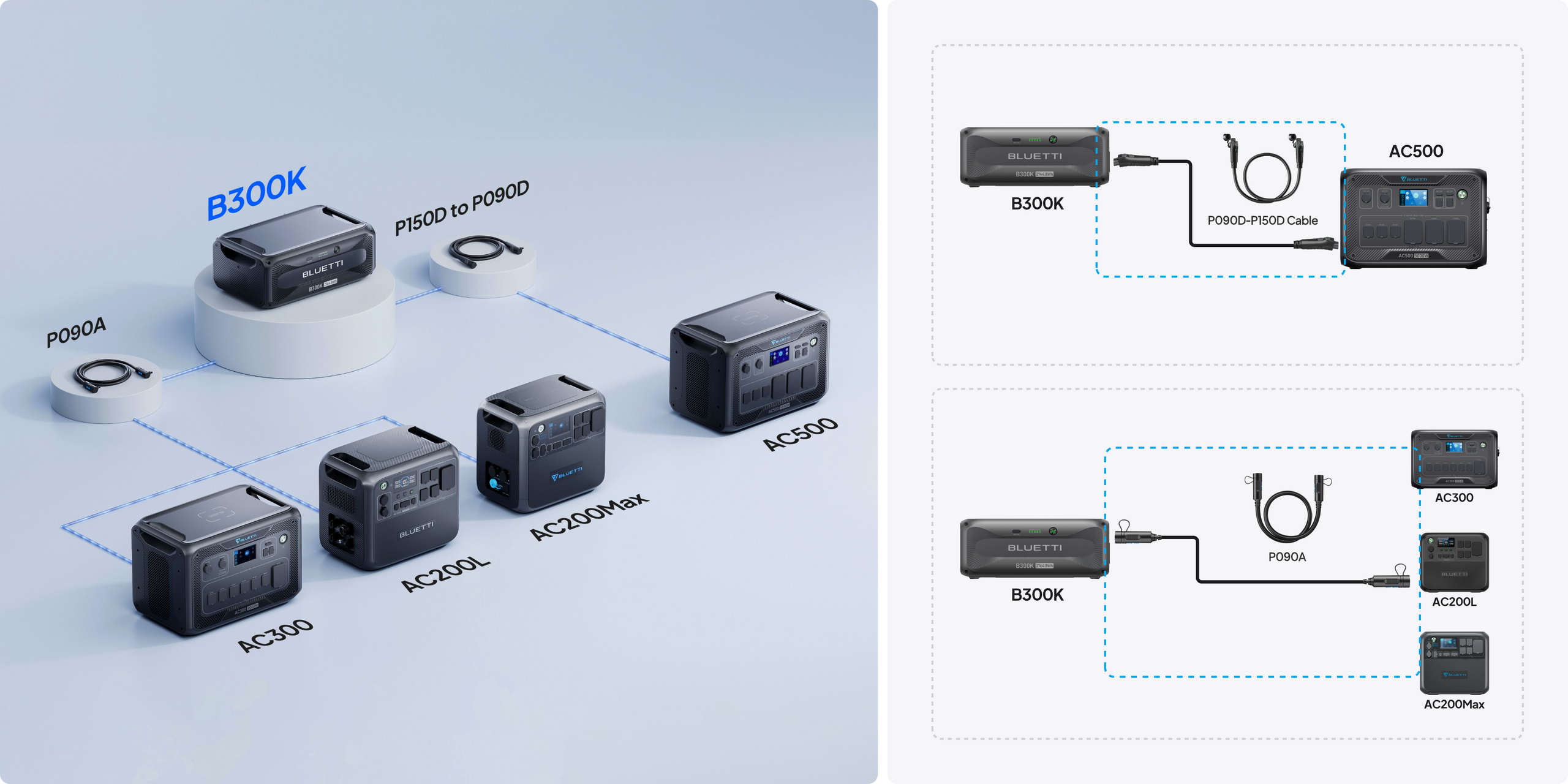 The AC500 supports up to 6 B300K. The P150D to P090A cable is required for connecting the AC500 with B300K or B300K with B300S. The AC500 can mix and match with B300, B300S, and B300K, with up to 6 total battery packs. Note: For the combo with one AC500 unit, if B300 is included, up to 4 battery packs can be connected; if not, up to 6 packs can be connected. -