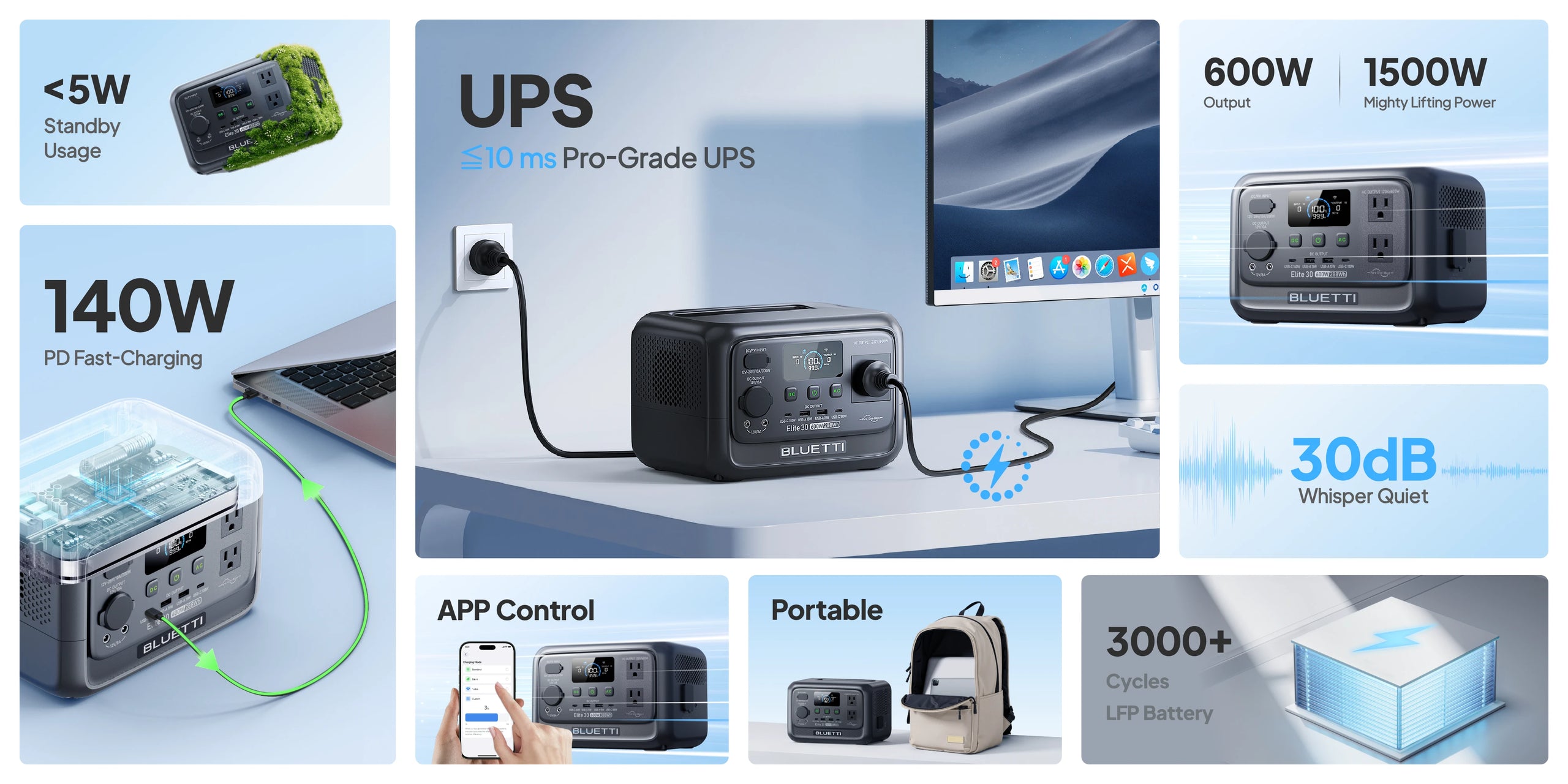 The Elite 30 V2 gives you 9 output ports and a reliable 600W continuous supply—perfect for running multiple small devices at once. Elite 30 V2 also features a USB-C port with PD 3.1 protocol, delivering up to 140W output—enough to rapidly charge high-performance laptops like MacBook Pro."